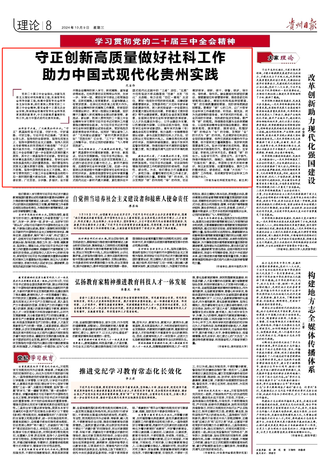党的二十届三中全会指出,创新马克思主义理论研究和建设工程,实施哲学社会科学创新工程,构建中国哲学社会科学自主知识体系。我们要深入贯彻党的二十届三中全会精神,落实省委十三届五次全会安排,深刻领会把握对哲学社会科学改革发展的新要求,守正创新高质量做好社科工作,助力中国式现代化贵州实践。