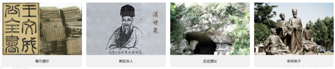 第四部分《亲传弟子》,有浙中、黔中、江右、安徽、楚中、闽东、岭南、北方、江苏弟子等生平事迹。亲传弟子有事迹可查的近150余人,有部分是《明儒学案》中未记入的,如《王阳明先生年谱》中所记“黔中王门”弟子陈文学(宗鲁)、汤冔(伯元)、叶梧(子苍)三人,以及詹良臣、李惟善、李良臣、越文实、汪原铭、朱克明、钱凤翔黔籍弟子的事迹,是目前资料最丰富的。入口选用龙场阳明洞塑的“龙岗论道”群雕像,目前已经上传100人资料。