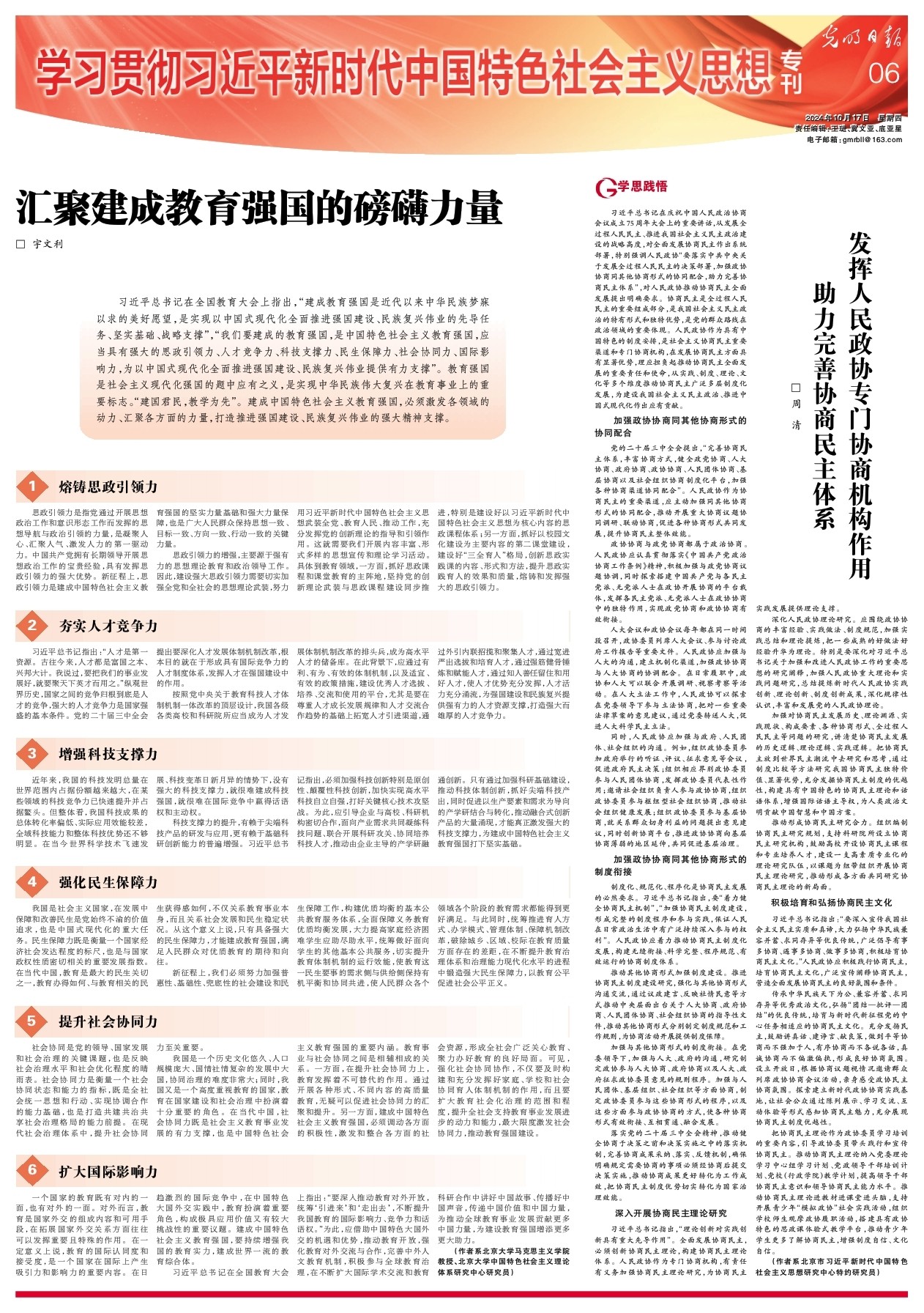 习近平总书记在全国教育大会上指出,“建成教育强国是近代以来中华民族梦寐以求的美好愿望,是实现以中国式现代化全面推进强国建设、民族复兴伟业的先导任务、坚实基础、战略支撑”,“我们要建成的教育强国,是中国特色社会主义教育强国,应当具有强大的思政引领力、人才竞争力、科技支撑力、民生保障力、社会协同力、国际影响力,为以中国式现代化全面推进强国建设、民族复兴伟业提供有力支撑”。教育强国是社会主义现代化强国的题中应有之义,是实现中华民族伟大复兴在教育事业上的重要标志。“建国君民,教学为先”。建成中国特色社会主义教育强国,必须激发各领域的动力、汇聚各方面的力量,打造推进强国建设、民族复兴伟业的强大精神支撑。