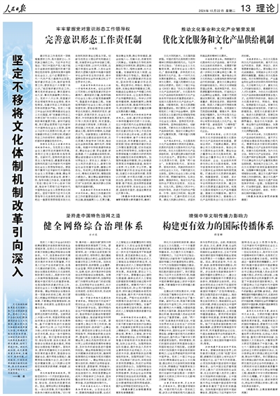 文化体制机制改革是文化领域一场广泛而深刻的变革。党的二十届三中全会《决定》聚焦建设社会主义文化强国,提出深化文化体制机制改革重大任务,明确改革路径和具体举措,为新时代新征程文化改革发展提供了根本遵循、指明了前进方向。新时代新征程,我们要聚焦重点领域、关键环节、瓶颈问题,以战略性、引领性改革举措不断深化改革,努力开创新时代宣传思想文化工作新局面。