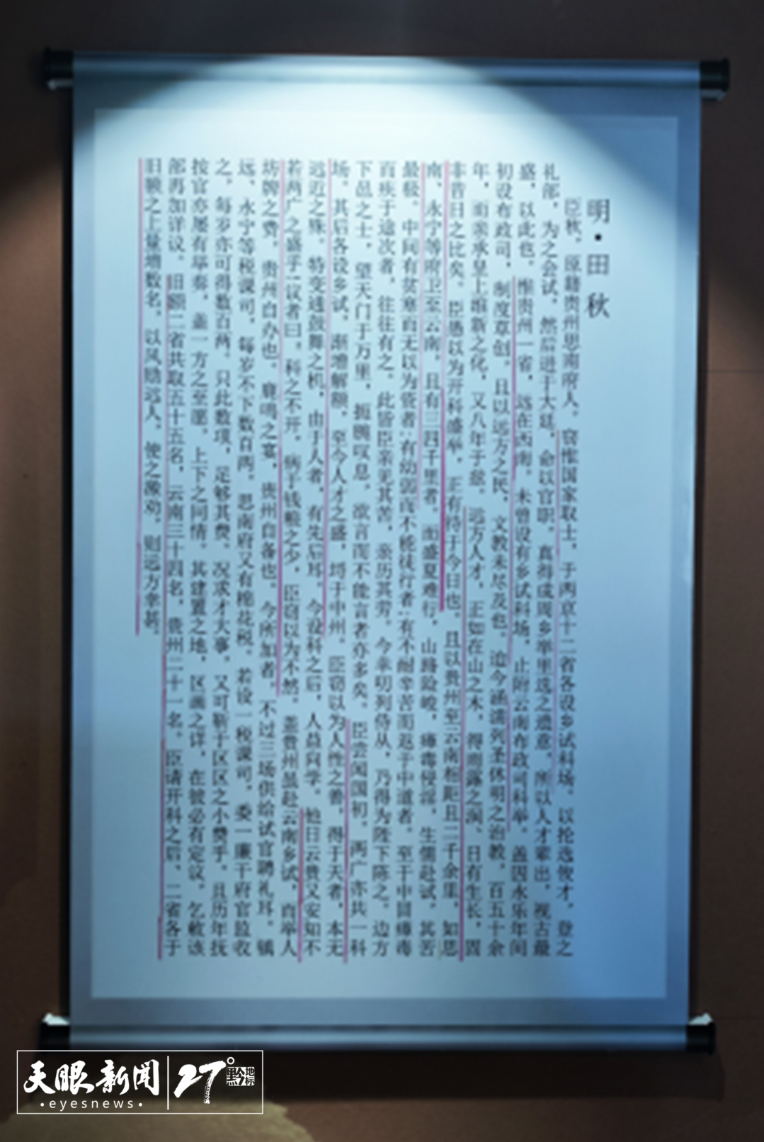 田秋在京做官期间,心系国家选材,嘉靖九年(1530),时任礼科左给事中的田秋向嘉靖帝呈《开设贤科以宏文教疏》,陈述贵州学子跋山涉水赴考之艰辛劳苦,发出“边方下邑之士,望天门于万里”之叹,而后又力陈贵州开科的必要性和重要性,还就贵州设立科举考场所需经费的筹措等提出了可行性分析和建议:“镇远、永宁等税课司每岁不下数百两,思南府又有棉花税,若设一税课司委一亷干府官监收之......只此数项足充其用”。同时以“求才”之由,奏朝廷准许贵州开科,以激励“人益向学”,可谓呕心沥血,竭心尽力。嘉靖十四年(1535),朝廷便将田秋奏疏交礼部复议后下发巡按贵州监察御史王杏,令其“勘议”,王杏支持田秋的建议,据实具奏,得到朝廷批准,并定云南四十名、贵州二十五名解额,令“各自开科”,嘉靖十六年(1537)贵州首开乡试,拥有本省科场。
