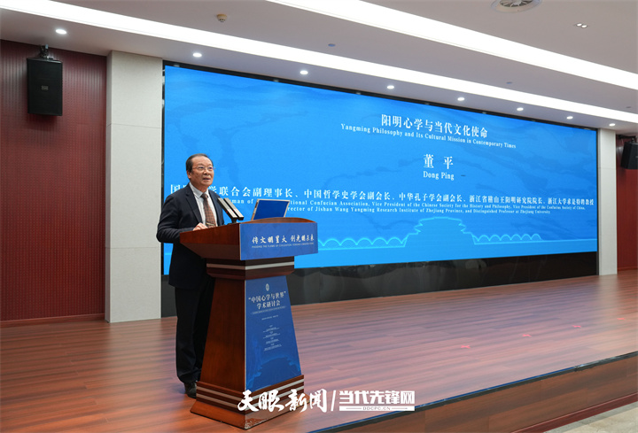 研讨会上,国际儒联副理事长,中国哲学史学会副会长,中华孔子学会副会长,浙江省稽山王阳明研究院院长,浙江大学求是特聘教授董平作题为《阳明心学与当代文化使命》的主旨发言。董平表示,要理解阳明心学的当代文化使命必须先了解什么是中国文化。他认为中国文化是农耕文化,有着东方独特智慧。