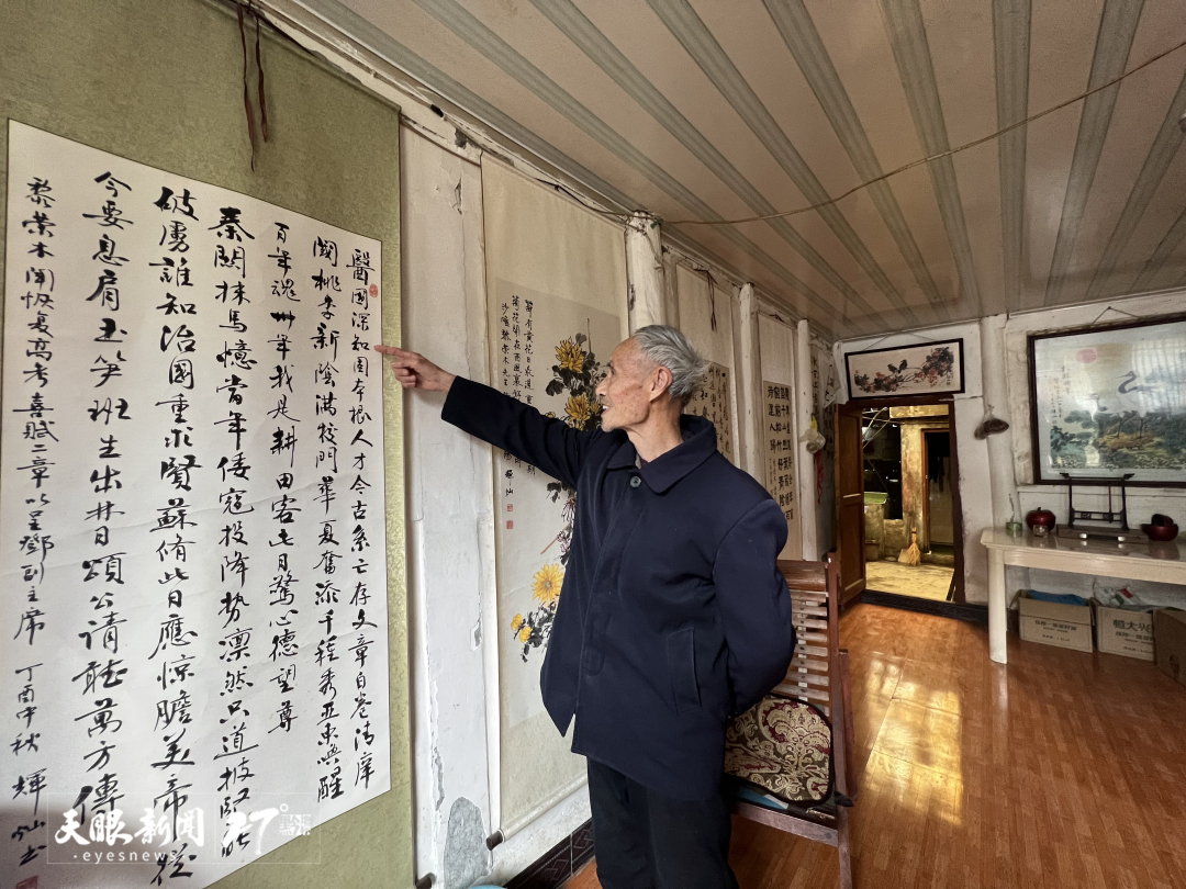 从“钦使第”出来,记者遇见了黎氏入黔始祖黎朝邦的第15代孙黎桦元,怀里抱着他的儿子。他带着我们去到了沙滩黎氏第14代黎培礼家,就在100多年前黎氏的“图书阅览室”——锄经堂。在黎培礼家门口,记者又遇见了黎氏第13代黎明汉。代代相续的沙滩黎氏,像环环相扣的时光链条,黎氏还是那个黎氏,生活却是全然不同的生活。黎培礼曾经独立管理和解说黎庶昌故居22年,如今那里被专业团队接管。他的屋子四壁糊满了字画,有的是别人的作品,而墙上和桌上更多是他自己写的诗,用毛笔工整地写好。他并不是祖先那样的文化人,也没受过多少教育,但这并不影响写诗成为他务农之余的爱好。桌上正摊开的是一首《失眠》:“斜月入窗前,迢迢夜未眠。感时因忆事,深夜闻鸡鸣。”听《沙滩村志》编纂者们说,沙滩村民至今很有多热爱写诗,诗歌的传统在村里一路绵延,每年重阳节的“沙滩文化九九晒诗会”,于2006年入选遵义市首批非物质文化遗产名录“文化空间类”项目。一个多世纪前的文化盛景虽已远去,但诗意的月光依旧照耀今人。他们的生活,就是活脱脱的“诗和眼前的田野”。
