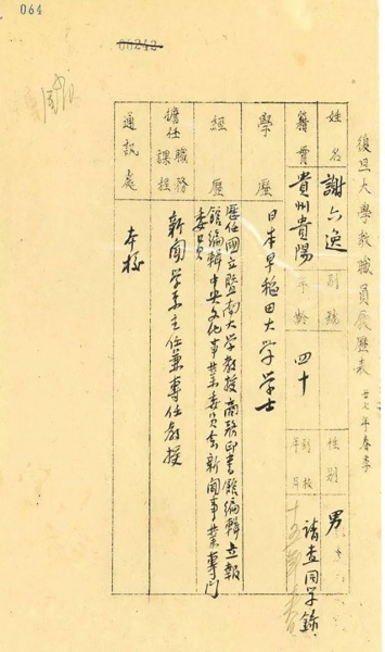 谢六逸履历表翻,拍自复旦大学档案馆馆藏。