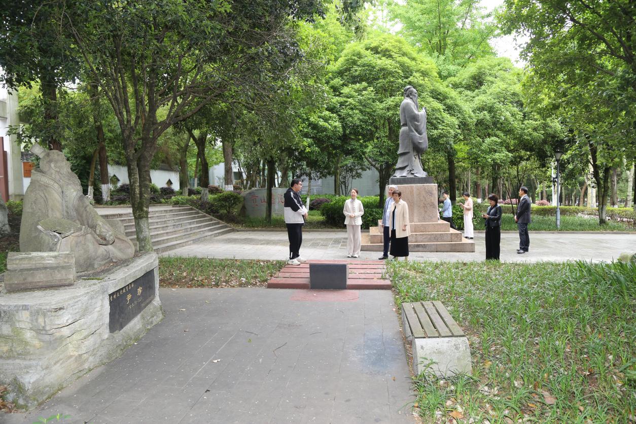 在书院大门前,殷校长了解由香港孔教学院院长汤恩佳博士赠送中国文化书院的孔子铜像,体会作致礼状孔子铜像所表达的中国传统儒家文化“仁爱、正义、中正、和谐”理念;了解贵州文化教育鼻祖尹珍远赴中原河南学习、返乡兴学并传播中原文化情况,以及自明代思想家王阳明在贵州龙场悟道并创建“龙冈书院”,文化脉络延续至清代“贵山书院”进而改制为“贵州大学堂”以来学校“书院-学堂-大学”百廿余年发展历程。