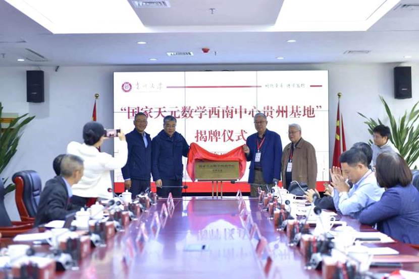 10月8日上午, “国家天元数学西南中心贵州基地”(以下简称“基地”)揭牌仪式暨第一次学术委员会和执行委员会会议在贵州大学举行。国家自然科学基金委天元数学基金学术领导小组组长田刚院士,国家天元数学西南中心主任李安民院士,国家自然科学基金委数理学部数学处处长赵桂萍,省科技厅厅长杨松,贵州大学副校长王锦荣出席会议。会议由我校科学技术研究院院长吴复忠主持。来自国家天元数学西南中心、西南财经大学、南京大学、四川大学等校的专家学者参会。
