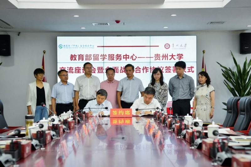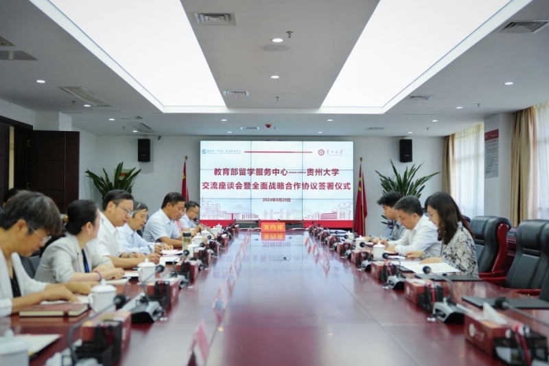 8月20日上午,教育部留学服务中心—贵州大学交流座谈会暨全面战略合作协议签署仪式在西校区贤正楼举行。教育部留学服务中心党委书记、主任王大泉,中国工程院院士、贵州大学校长宋宝安出席会议,教育部留学服务中心国际合作处以及我校党委办公室、校长办公室、国际交流与合作处、教务处、研究生院、国际教育学院和相关专业学院的主要负责人参加会议。副校长张大林主持会议。