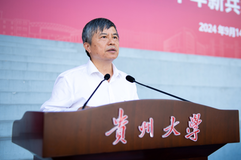 校长宋宝安院士向即将奔赴军营的应征入伍大学生表示祝贺,并向长期以来关心和支持学校征兵、军训工作的花溪区人民武装部、武警贵州总队机动支队表示感谢。他对新兵同学们提出了三点希望:一是要忠于理想信念,练就“金刚之心”,始终在党的理论引领下前进,为国家、为人民撑起安全祥和的蓝天;二是要忠于责任职守,磨砺“钢铁之身”,秉承学校“明德至善 博学笃行”的校训精神,严格要求自己,苦练军事技能,展现当代军人的精神风貌;三是要忠于担当奉献,争当“模范之兵”,以优秀校友为榜样,将个人成才与国防建设紧密结合,为建设强大国防贡献力量。