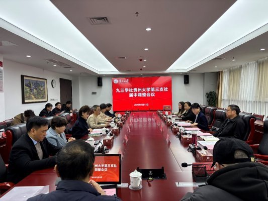 1月13日,九三学社贵州大学第三支社召开届中调整选举会议。九三学社贵州省委专职副主委刘晓静出席会议并讲话。会议由省政协委员、九三学社贵州大学委员会主委、贵州大学科学技术研究院院长吴复忠主持。贵州大学党委办公室、校长办公室主任兼党委统战部部长胡小兵,九三学社贵州省委组织处处长黄亚坤参加会议。