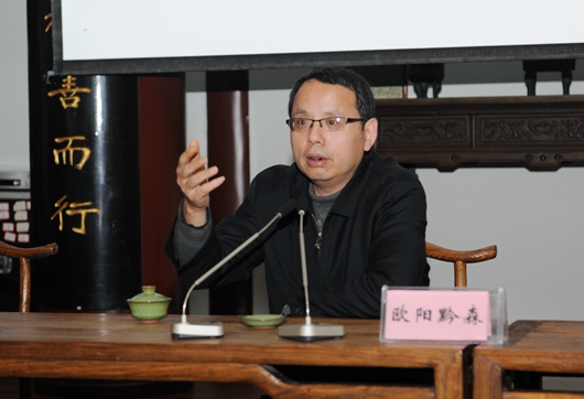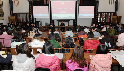 12月19日下午,我校第376期文科讲坛在文化书院勉学堂举行,贵州省文联、作家协会主席欧阳黔森作题为“文化的自省、自信、自强”讲座。校长郑强出席,校党委副书记骆长江主持。