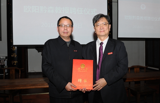 最后,郑强为欧阳黔森颁发聘书,正式聘任欧阳黔森为贵州大学名誉教授。
