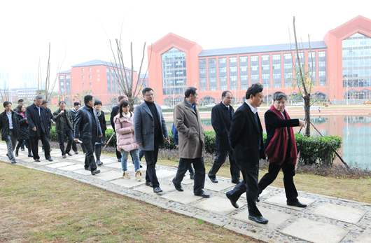 考察组一行沿路参观了崇学楼、新校区体育馆、崇义楼圆形会议厅、育贤亭广场、阅湖等地,并就校园规划、生态、自然、建设、布局、文化等方面的情况与校领导进行交流。