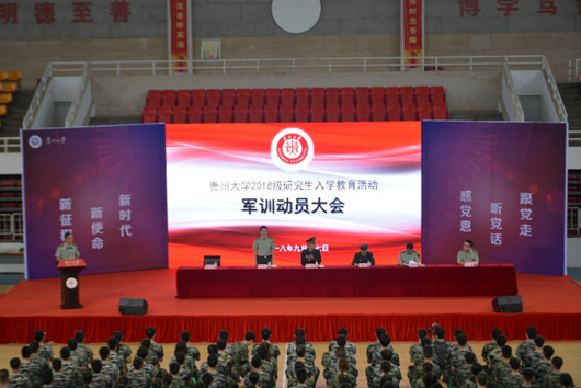 9月17日上午,贵州大学2018级研究生军训动员大会在北校区体育馆举行。常务副校长、军训师师长王红蕾,副校长、军训师政委向淑文,校学生处、校团委等相关部门负责人、军训团各团部成员,全体教官,各连指导员及全体受训研究生参加大会。大会由党委研究生工作部部长、军训师副政委罗勇主持。