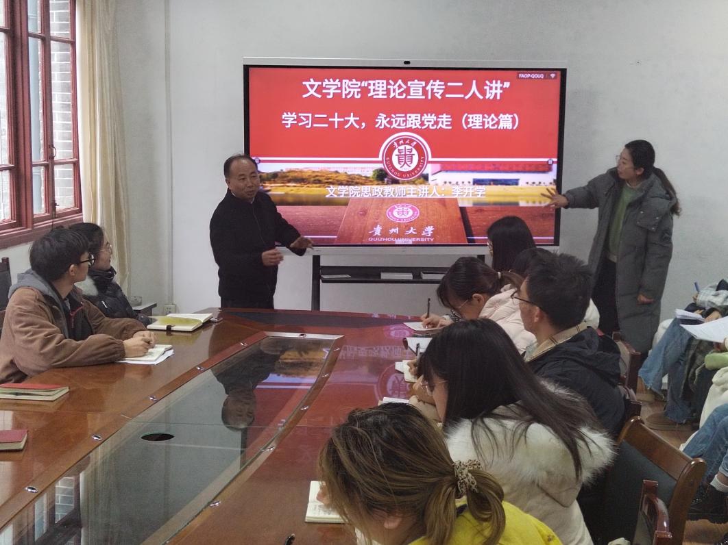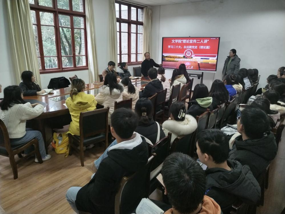 根据校党委2023年9月8日印发的《关于在全校开展新时代党的创新理论“理论宣传二人讲”宣讲的通知》,为促进我院学子深入了解新时代党的创新理论,文学院思政课教师主讲人李开学和学生主讲人袁艺于2023年12月21日在人文楼204会议室,面向汉语2101班全体同学进行理论宣讲。