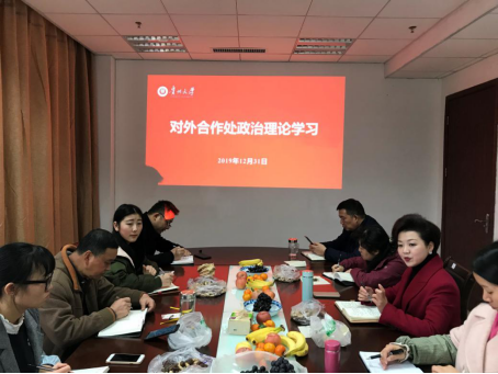 12月31日上午,对外合作处在贤正楼 403会议室召开政治理论学习会议,会议由刘颖副处长主持(主持工作),对外合作处全体人员参加会议。