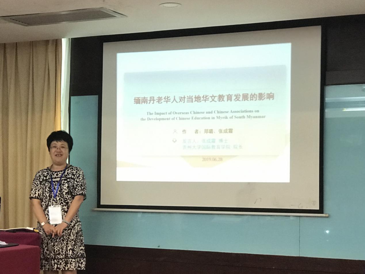 在分组讨论上,张成霞院长作了题为《缅南丹老华人及华人社团对当地华文教育发展的影响》的报告,从丹老地区华文教育发展及现状;丹老华人及华人社团在当地华文教育发展中的角色和作用;丹老华文教育发展的制约因素和对策思考等方面进行了详细阐述。