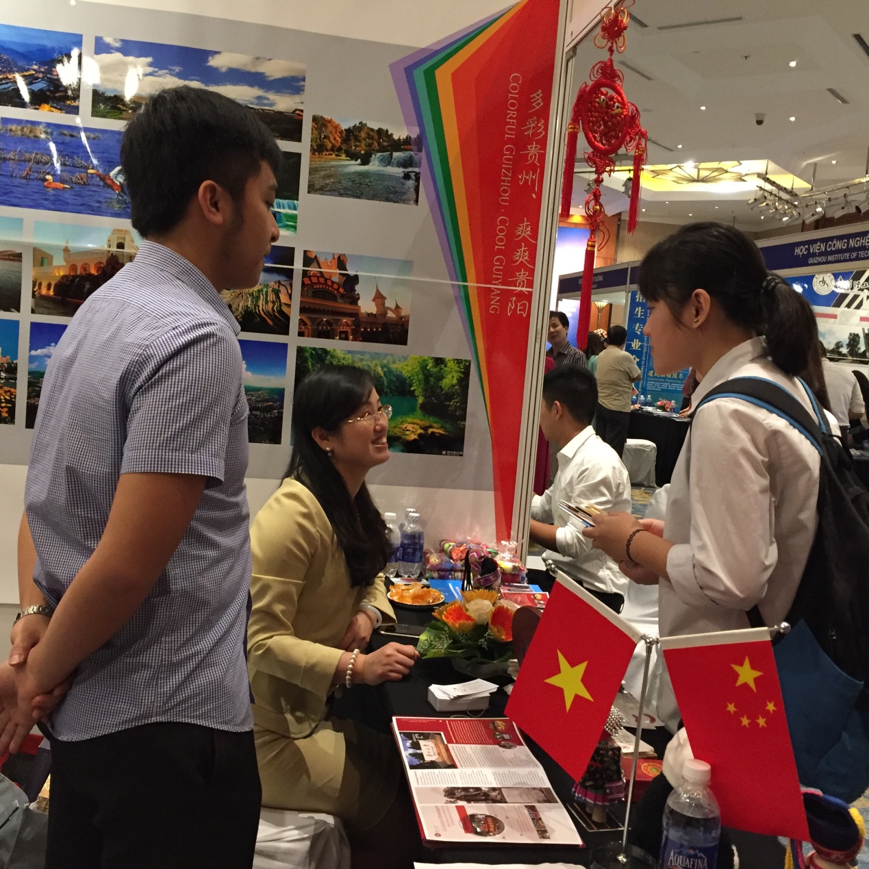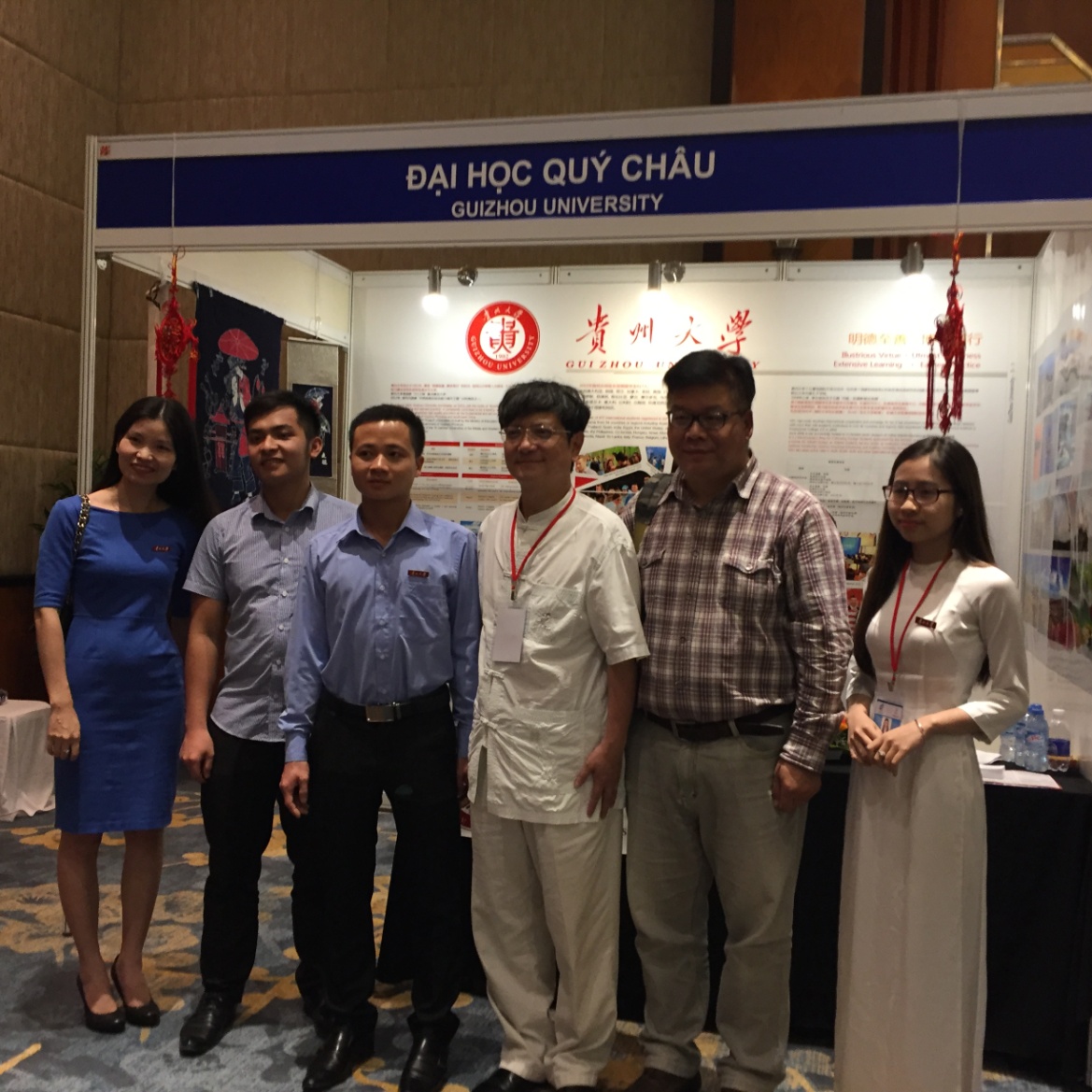 图为黎文军在向咨询的学生介绍贵州大学;图为黎文军(左2)和其他越南校友与贵州大学校长郑强(右3)合影留念。