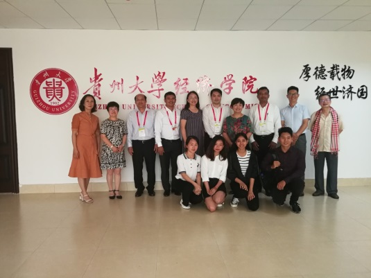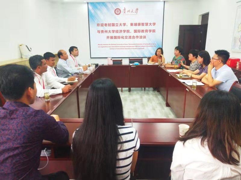 (3)7月23日上午,贵州大学经济学院党委书记黄莉、院长伍国勇、副书记杨海、副院长马红梅,国际教育学院党委书记晋克俭、院长张成霞等与老挝国立大学工商管理学院院长DePhetsa mone PHOMMAVONG先生一行、柬埔寨智慧大学暹粒校区副校长Samlei Chhoun先生一行,在西校区崇文楼425会议室进行交流洽谈,双方就学生交流、教师互访、科研合作等进行了讨论并达成初步共识。
