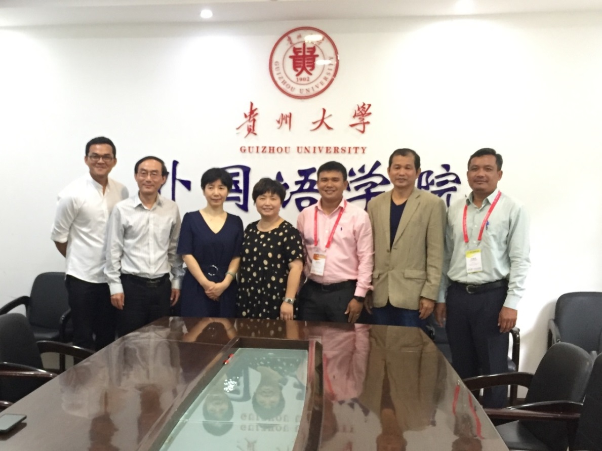 (4)7月24日,柬埔寨智慧大学暹粒校区副校长Chhoun Samlei、国际处长等一行四人访问贵州大学,并与旅游学院、外国语学院进行了友好座谈。座谈会在外国语学院举行,旅游与文化产业学院副院长李锦宏、外国语学院院长周杰、国际教育学院党委书记晋克俭、外国语学院副院长宁梅参加了座谈。双方就各自学校及学院的办学情况进行了介绍,并对双方感兴趣的学生交换项目、中国学生赴对方大学进行假期实习、汉语教育等方面展开了热烈的探讨,初步达成了今后双方进行合作交流的意向,座谈会在愉快的气氛中结束。