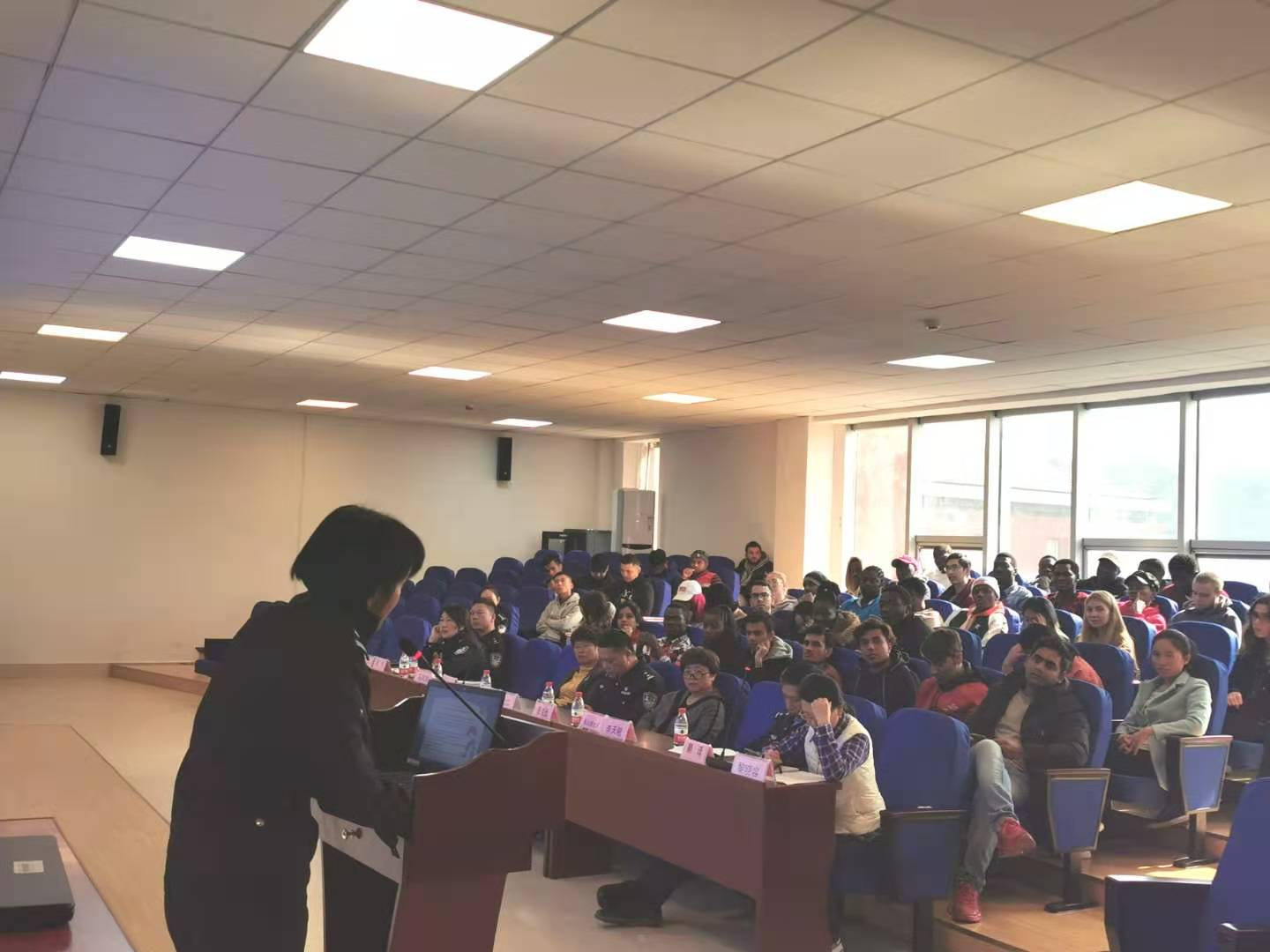 11月12日上午9时,贵州大学国际教育学院留学生法律法规及安全讲座在西校区经济学院523多媒体教室举行。贵阳市公安局出入境管理分局、贵阳市公安局花溪分局、松山派出所一行6名警官出席。来自33个国家的50余名在校留学生及国教院全体老师参加了此次讲座。
