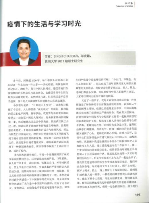 疫情期间,留学生们的亲身经历、真实感受和所思所想,展示了中国人民在以习近平同志为核心的党中央的坚强领导下,众志成城,抗击疫情的伟大斗争,为世界各国人民了解中国抗“疫”历程提供了新的视角,展示了贵州大学践行“三全育人”方针,培养“知华友华爱华”国际人才,服务国家外交大局所做的努力和贡献。