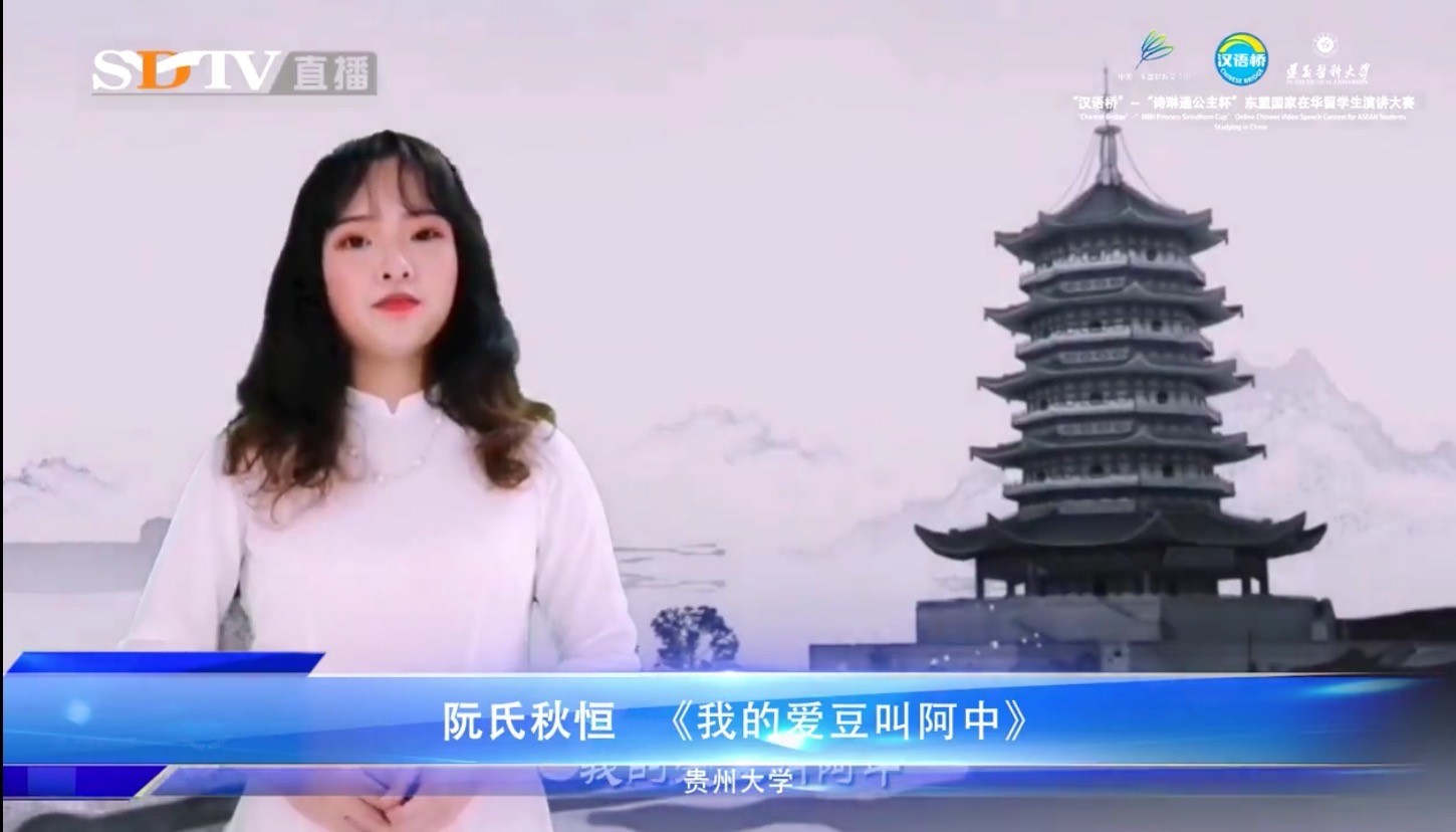由于受疫情影响,本次演讲比赛采用线上视频比赛方式。在演讲中,越南留学生阮氏秋恒把对中国的感激和喜爱相结合,亲切地将中国比作偶像,并称其为 “阿中哥”,将中国的大好河山与人文风情,贵州大学的美丽校园与人文底蕴,以及疫情发生后学校老师的温情关怀与悉心照顾配以精美制作的视频背景,获得了评委们的一致好评。