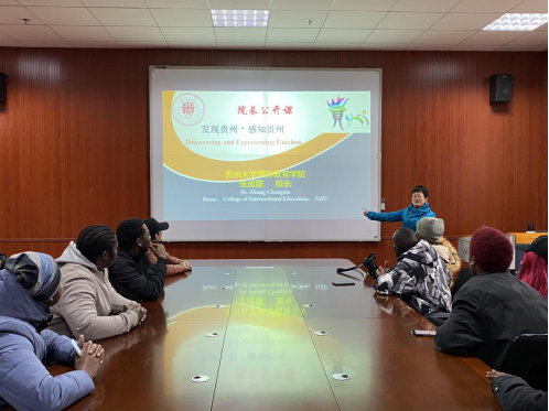 为做好留学生省情教育,丰富留学生的课余生活,扩展留学生的文化知识,12月18日下午2点30,国际教育学院在明正楼524多媒体教室举办了题为“发现贵州·感知贵州”的院长公开课。本次主讲人为国际教育学院院长张成霞,国际教育学院60名在校留学生现场听课。