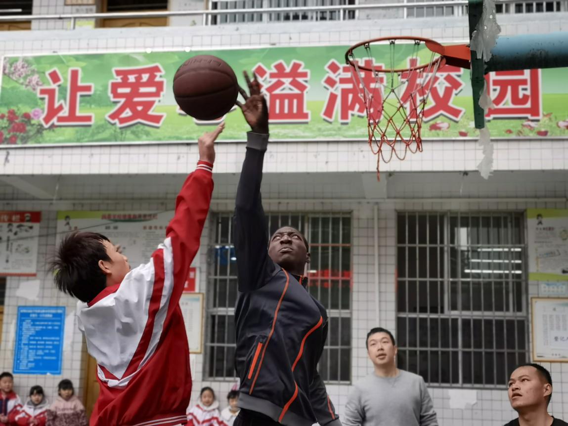 英语互动课堂进行的同时,国际教育学院与园晨学校师生进行了一场3V3的师生篮球联谊赛,球赛开始前双方师生进行了握手致意,球赛开始后双方比分你追我赶不分上下,比赛过程既激烈又友好。来自加蓬的高曼还为现场观看比赛的小学生们表演了扣篮,赢得一阵热烈喝彩。