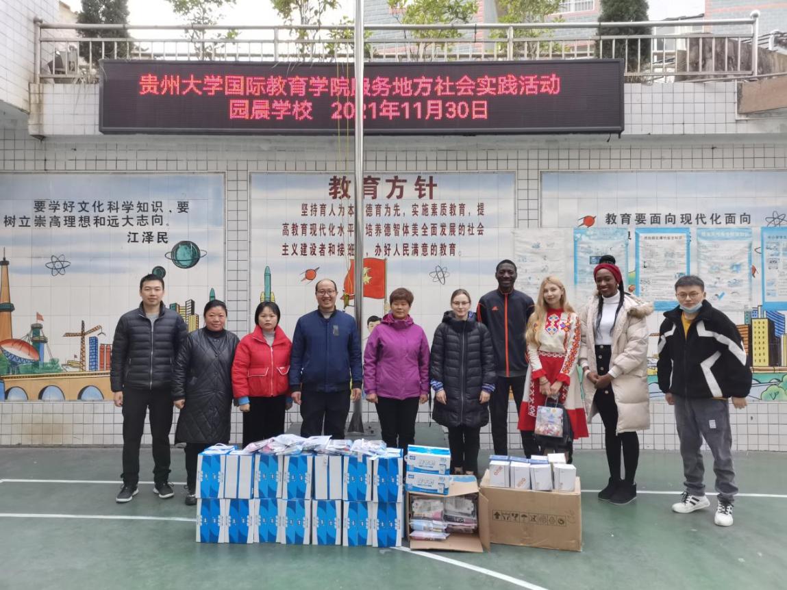 2021年11月30日,国际教育学院组织师生代表8人赴南明区云关乡园晨学校开展“服务地方社会实践”活动。活动由学院党委副书记甘孝琴带队,3名教职工代表,以及来自俄罗斯的缇娅娜、尼日利亚的刘雨佳、哈萨克斯坦的美丽、加蓬的高曼参与活动。