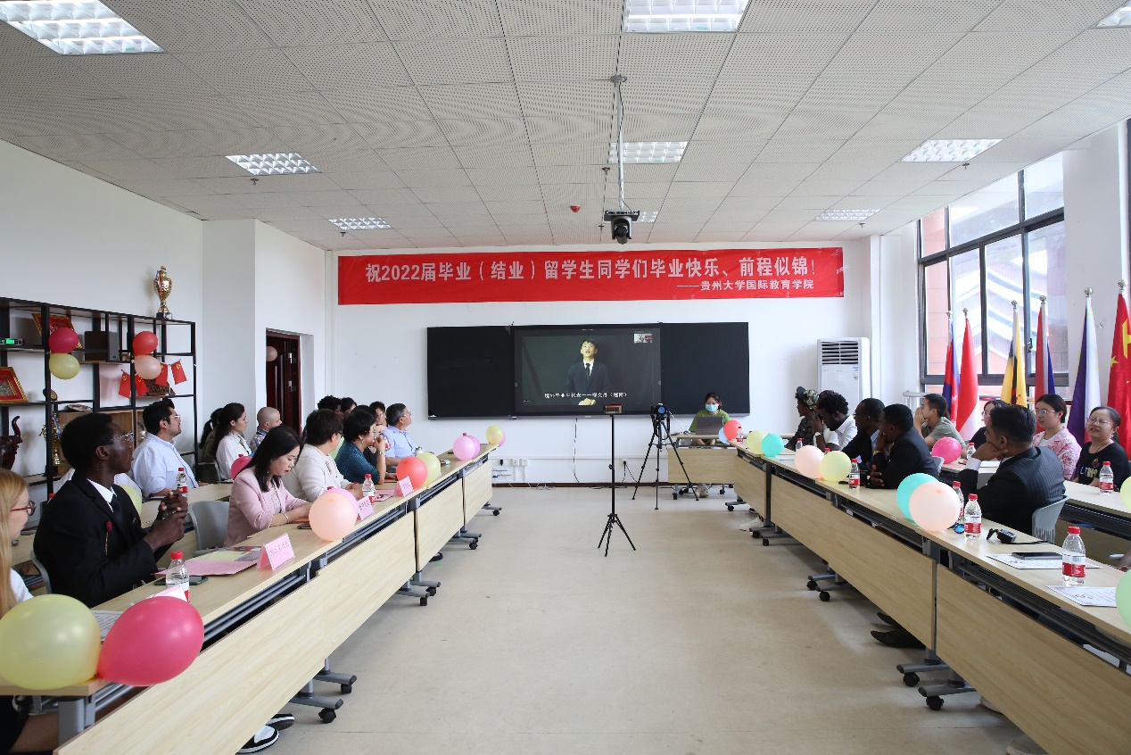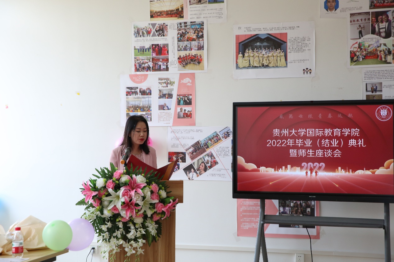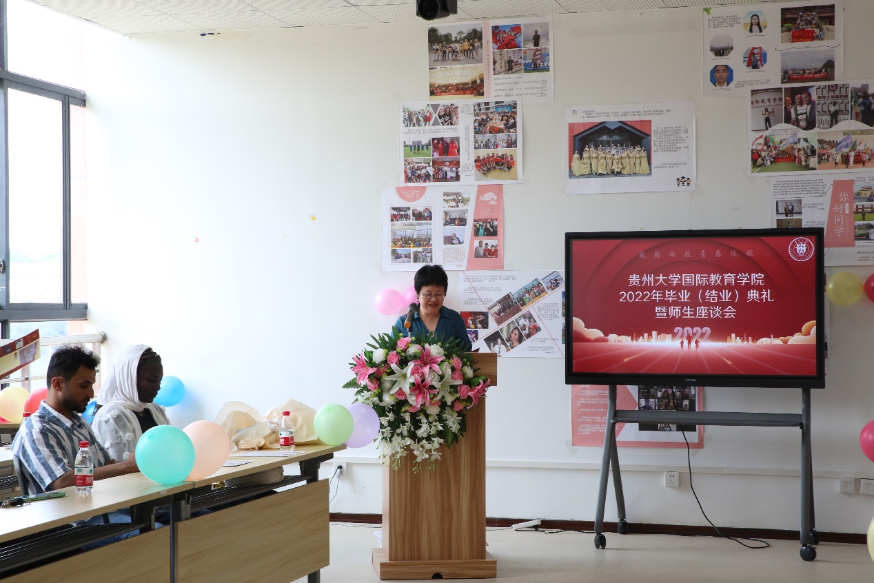 在师生合唱《贵州大学校歌》后,毕业(结业)典礼结束,转入师生座谈会,每位境内毕业(结业)留学生纷纷表达了对学校、老师和同学的不舍,亚历山大回忆了自己在疫情期间擅自外出到三亚后,如何在老师的帮助下回到学校;爱月回顾了自己刚到贵大时,假装生病不想上课的经历;缇娅娜一个劲地说“舍不得,好舍不得”......座谈会上,师生们几度哽咽,但是,不得不分别。最后,晋克俭代表学院,欢迎毕业(结业)留学生们常回“家”看看。