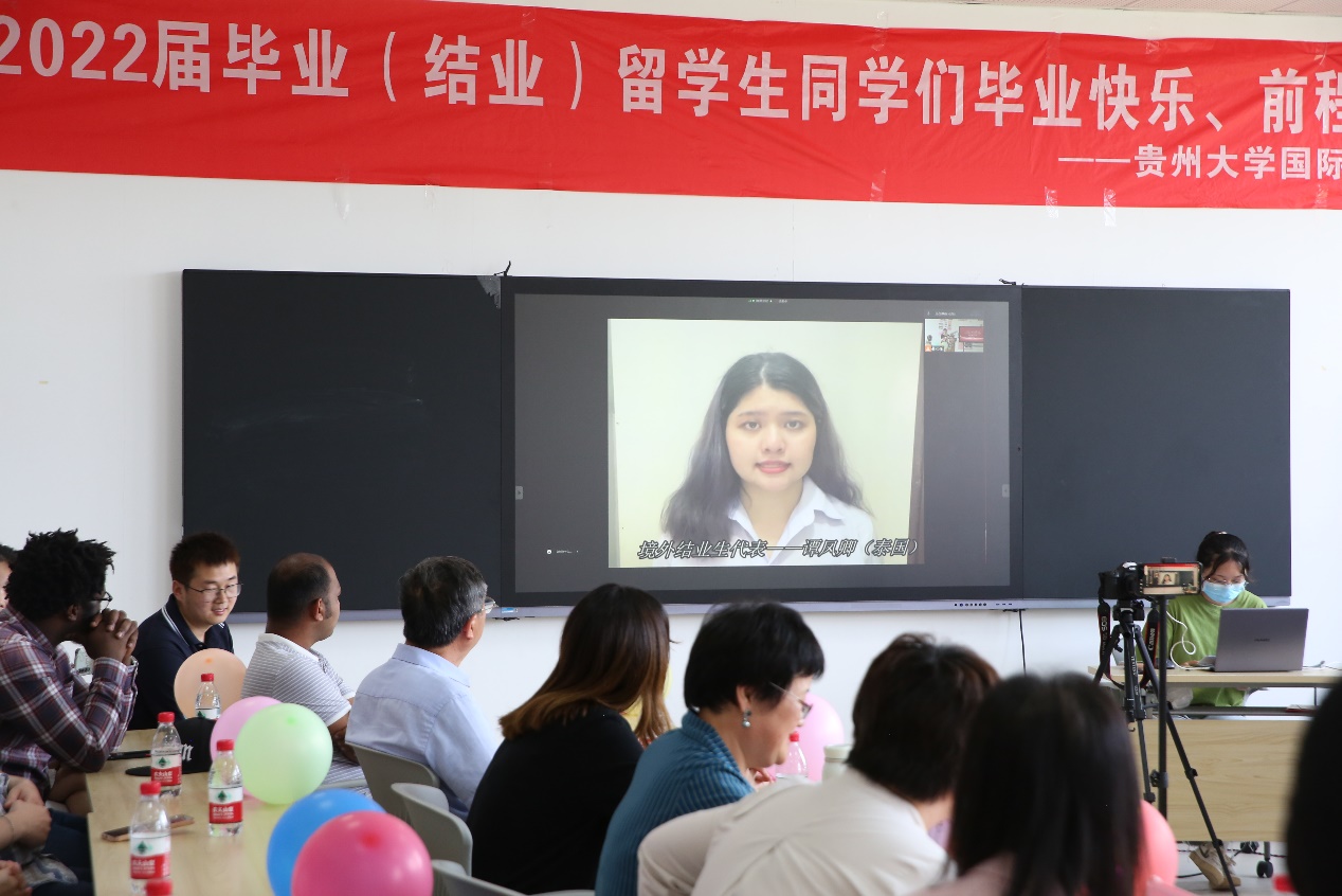 越南籍留学生禄文丹、泰国籍留学生谭凤卿分别代表境外毕业、结业留学生发言。发言中,两名留同学表达了由于疫情不能在中国境内学习的遗憾,表示有机会会再到中国,再到贵州,再到贵州大学。禄文丹还用熟练的贵阳话说了一段rap:“贵州真的好想你哦。离开贵州两年,彷佛听到熟悉的贵州方言,市场里的“十元三斤”“烤洋芋”的叫卖声。时不时的想起酸汤鱼,凉拌折耳根的味道。我们贵州都好,人好,天气好,山水好, 来了会念念不忘。来嘛,欢迎来我们贵州!”