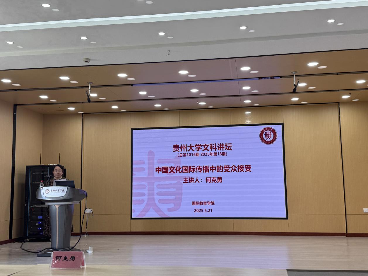 5月21日下午,贵州大学文科讲坛(2025年第18期)在明正楼428教室举行,本次讲座由国际教育学院承办,中央民族大学外国语学院翻译系二级教授、翻译方向博士生导师何克勇教授受邀担任主讲嘉宾,讲座题目为“中国文化国际传播中的受众接受”。讲座由国际教育学院院长宁梅主持,国际教育学院全体教师和外国语学院部分师生聆听了讲座。