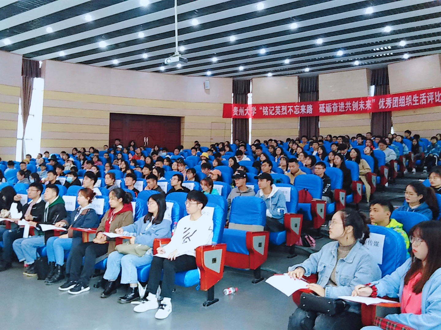 主持人讲解完规则后,评比正式拉开了帷幕。各团支部围绕“铭记英烈不忘来路 砥砺奋进共创未来”主题,按照抽签顺序依次上台进行展示。通过各种形式生动展现了各支部活动成果,体现了贵大学子对革命先烈的崇高敬意,以及勇担时代使命的青春风貌。此外,各支部还开展了“社会主义核心价值观宣传月”、“普通话宣传周”、“杜绝浪费·光盘行动”、“拒绝毒品”等一系列相关活动,引导大学生积极向上,健康生活。