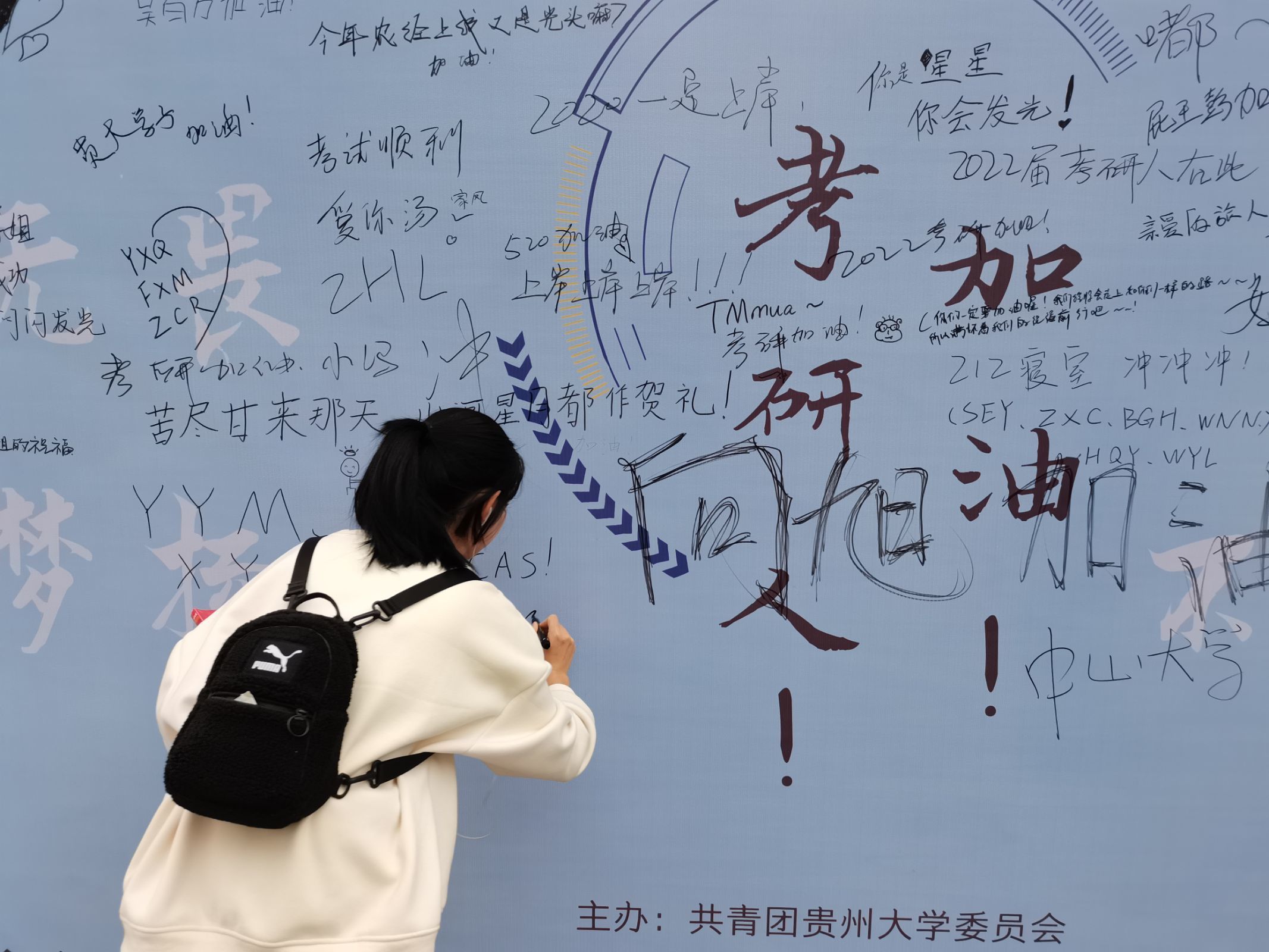 “星光不问赶路人,时光不负有心人”、“祝学长学姐们,研途闪闪发光”、“念念不忘,必有回响”、“考研人加油!”…考研教室外,祝福墙上,一横一竖,满是学弟学妹对考研学子的衷心祝福与鼓励;一撇一捺,传递的是整个校园对考研学子的深切关怀和支持。