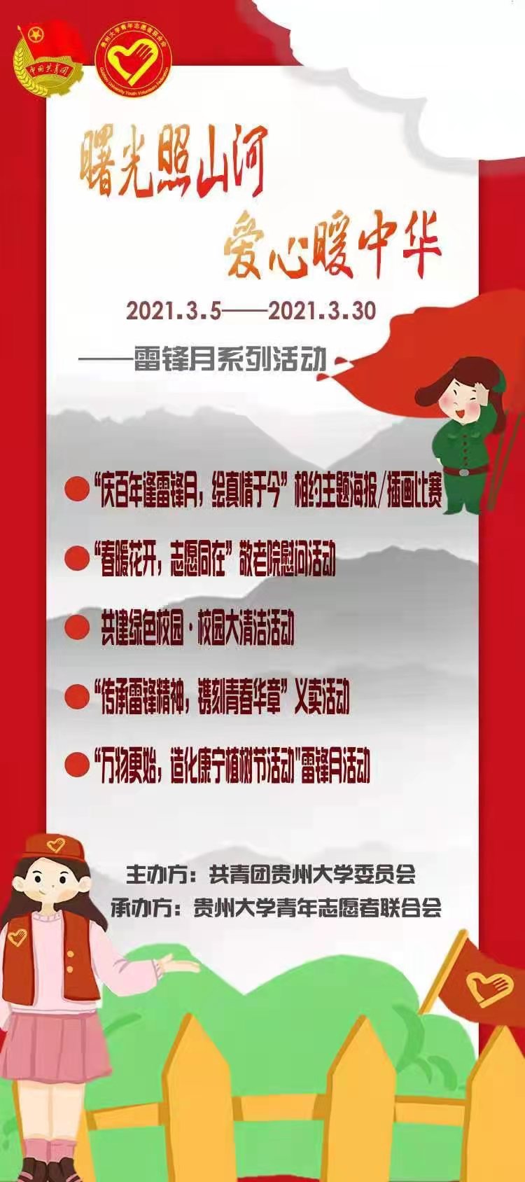 团委网站讯 2021年3月5日,为践行社会主义核心价值观,弘扬雷锋精神 ,由贵州大学团委主办,贵州大学青年志愿者联合会(以下简称青志联)承办的“曙光照山河,爱心暖中华”雷锋月系列活动启动仪式在西校区和南校区同步开幕。