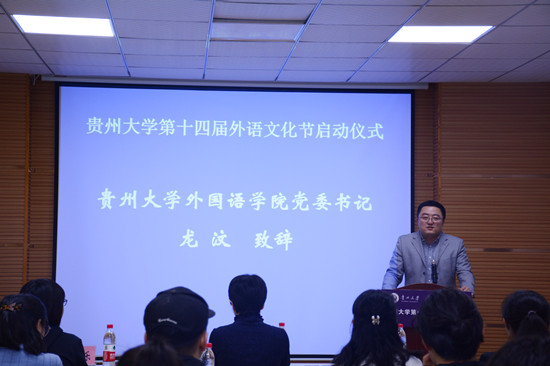 龙汶致辞,对关心、支持、组织和筹备第十四届外语文化节的团委、学生会和师生表示感谢。我校始终坚持利用第二课堂活动培养学生的社会责任感、实践精神和创新能力,外语文化节已经连续成功举办了十三届,经过积累、传承和创新,在开拓学生的异域视界,提升学生外语实践能力,推动优良学风的建设,繁荣校园文化生活,积极推进第二课堂建设等方面产生了重要的积极影响,现已成为全校性的品牌活动。希望活动能秉持外院“特色就是卓越,理想创造辉煌”的理念并落到实处。