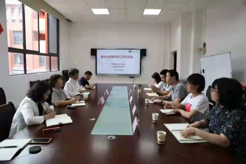 团委网站讯7月6日,贵州大学留学生工作交流会在国际教育学院会议室召开,国际教育学院党委书记晋克俭、副书记甘孝琴,校团委副书记(主持工作)刘魁,副书记杨乐、宋洪庆、杨晓椿,以及两部门相关同志参加。