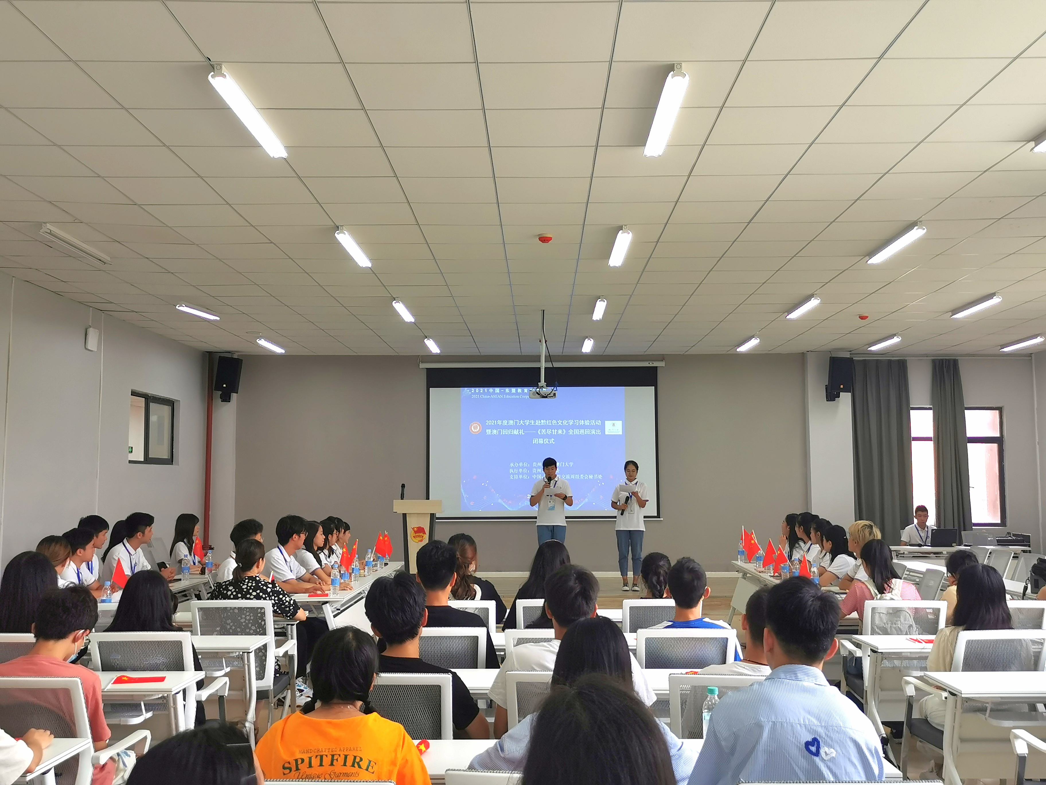 闭幕式伊始,澳门大学学生代表梁思傲、石恩慈与大家分享自己在红色文化学习体验活动中追寻革命足迹、缅怀革命先辈,切身感受无数英雄先烈的无私奉献、奋发进取革命精神的红色体验以及来到贵州所体会到的风土人情、美食文化等难忘经历。