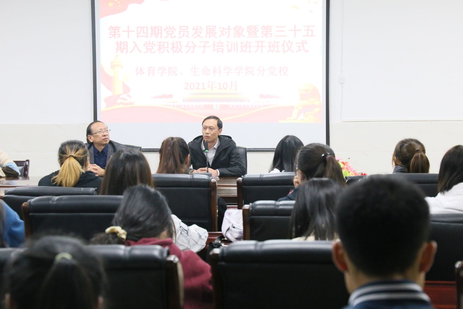 团委网站讯(记者 严嫣 报道|摄影)为贯彻党史学习教育精神,明确入党目的,坚定共产主义理想信念。10月12日,体育学院第十四期发展对象暨第三十五期积极分子开班仪式在西区体育馆106会议室举行。学院党委书记肖内昆、党委副书记毛元华、学生辅导员翟荣飞以及58名同学参加了此次仪式。仪式由翟荣飞主持。