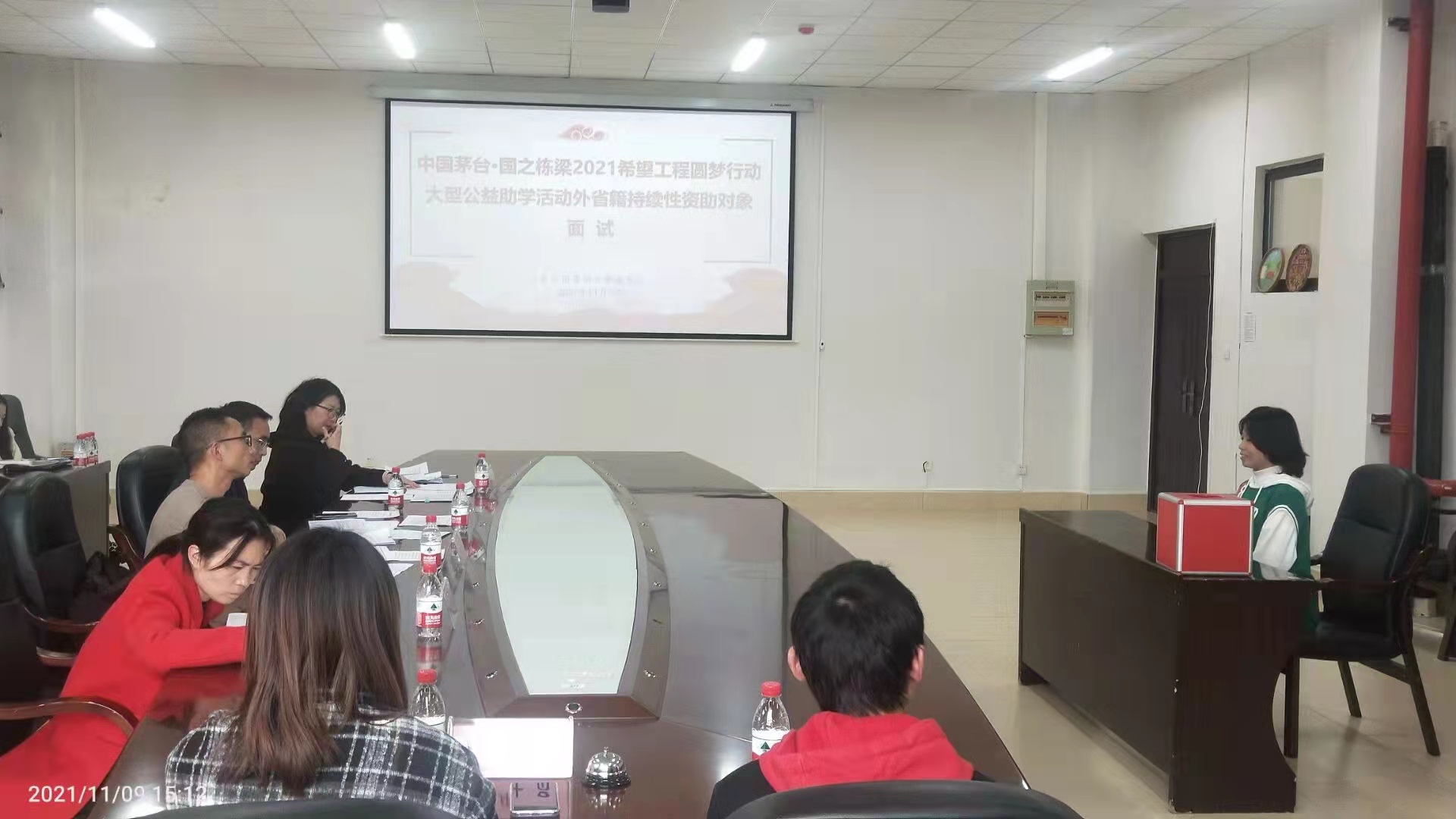 团委网站讯11月9日下午,由校团委主办的“中国茅台·国之栋梁2021希望工程圆梦行动大型公益助学活动”外省籍持续性资助对象选拔面试在雅文楼311会议室顺利进行。由党委学生工作部副部长王明、对外合作处副处长赵鹏、学生资助管理中心张先老师和校团委副书记杨晓椿担任面试评委。