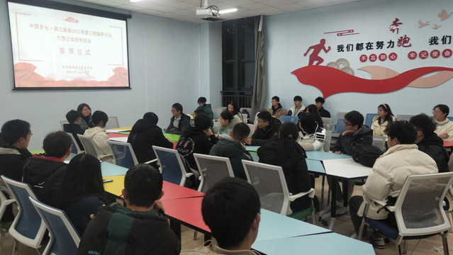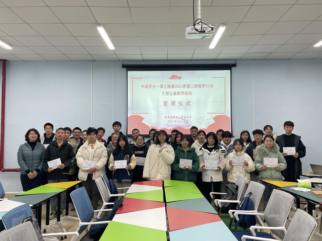 团委网站讯12月15日,“中国茅台•国之栋梁2021希望工程圆梦行动大型公益助学活动”签领仪式在我校雅文楼217A顺利举行。校团委副书记杨晓椿、科技实践部负责人苟萌萌,及30名获资助学生参加本次仪式。