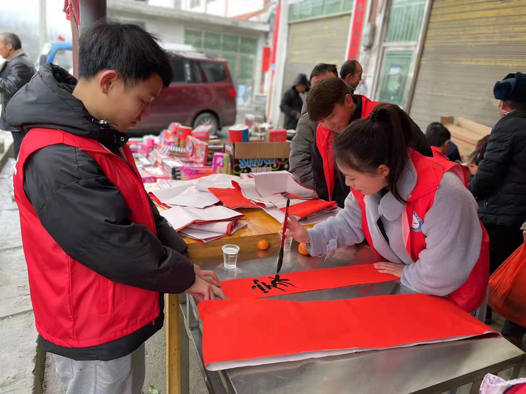 (图为袁霜霜同学与队员一起写春联 通讯员供稿)