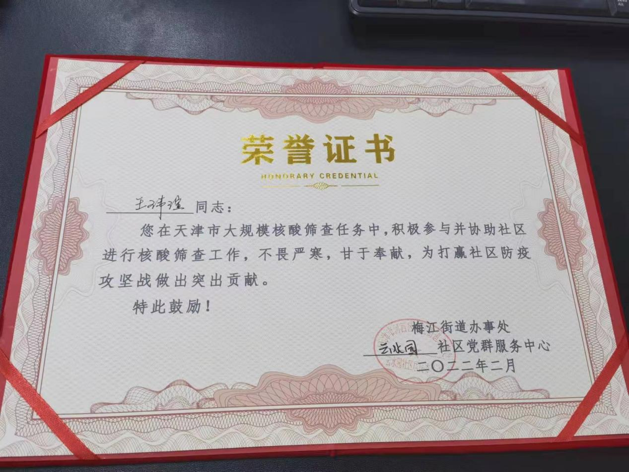 经济学院的王玮瑄同学,刚回到家乡天津不久,就遇到天津新冠疫情爆发。在全城核酸筛查的前一天,作为入党积极分子的王玮瑄,向所在社区街道提交了志愿服务申请书。在北方零下几度的寒风中志愿服务完成4次核酸筛查,搬运物资、维护秩序、回答询问、帮老助弱,王玮瑄全身心投入其中。“作为入党积极分子、作为班长、作为一名天津人,我必须第一时间站出来”“本次志愿服务让我的心性变得更加沉稳,为人民服务的决心变得更加坚毅,让我离一名合格的中国共产党党员更近了一步”王玮瑄说。