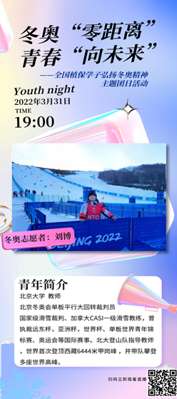 活动第一部分主题为冬奥故事分享,由参与本次北京冬奥会单板平行大回转的裁判员、北京大学教师刘博以及担任首钢大跳台赛事服务副经理、北京理工大学辅导员申大为两位老师分享自己的冬奥经历和感悟,带领众学子回顾冬奥精神,从中汲取不断前行的力量,以青春之名,承时代使命,于奉献中坚定理想,扬青春风貌。随后,来自北京大学的何立晗、北京外国语大学的张聪伟和中国农业大学的王皓,以及河北农业大学的王至莹四位冬奥会学生志愿者代表分别分享了自己的冬奥志愿经历,于志愿行动中彰显担当,开风气之先,领时代风华。