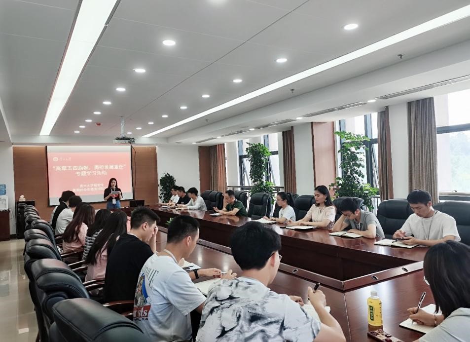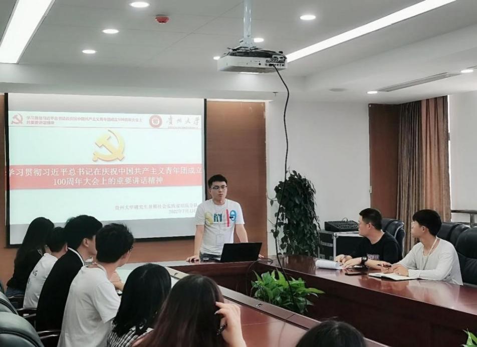 团委网站讯 为喜迎党的二十大、庆祝建团100周年,展现新时代青年风采,团结引领广大青年勇担时代发展重任。7月13日下午,我校2022年暑期社会实践省招院分队顺利开展了以“高擎五四旗帜,勇担发展重任”的专题学习活动,贵州大学研究生工作部老师吴德刚出席会议并讲话,实践队员梁艳艳主持会议。