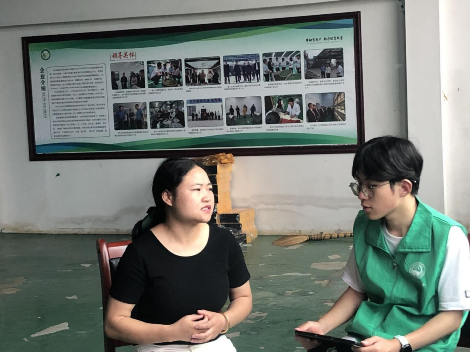 参观后,副队长杨铭瑄对阮建超进行了采访,队员们了解到阮建超是在2018年花费20余万学习茶叶的制作,公司经营范围茶叶种植、加工及销售。主要产品有:盘江绿茶、盘江红茶等。现有员工50人,同时带动扶贫户20人就业,公司辐射辖区200余户贫困户定点销售茶青增加收入。阮建超向我们介绍了该公司主要经营范围,规模和发展状况,在当地投资了900亩的茶叶基地。该公司是将茶叶大多销往浙江和山东,该公司是根据购买方所需口感,为其定制茶叶。现在是广东省对点帮扶为广东那边的客户定制茶叶。公司春茶销售情况最好,夏秋茶是通过订单进行制作,一般会生产20000斤左右,只要达到欧盟标准后很多商家都会接受。