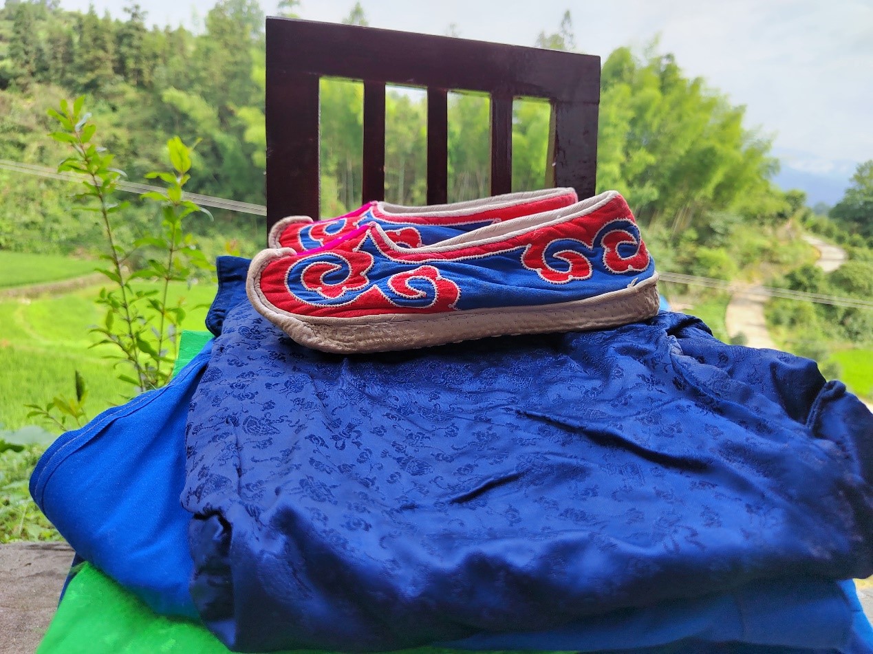 四十八寨歌节是流传在贵州天柱县境内清水江中下游地区的民间歌会,包括13个歌场。当地的人们称参加歌会为“赶歌场”,每个歌场每年赶一次,从农历三月开始到九月结束。每到集会时间,山坡上、公路旁人山人海,歌声此起彼伏。在平时生活中虽然苗族讲苗语,侗族讲侗话,但在四十八寨,唱起歌来,却一律只能用侗话唱,这是长期以来形成的演唱习惯。部分妇女去“赶歌场”时都会穿上他们的少数民族服饰,她们穿上喜爱的民族服饰聚集在一起,相互对唱。潘爷爷说这也称为“扮侗”。同时,潘爷爷将家中仅有的“扮侗”服饰拿出来给实践队员展示,并将曾经老伴“扮侗”时的照片拿给实践队员欣赏。随后,潘爷爷讲解到“扮侗”服饰里的“勾勾鞋”是全手工缝制的,一针一线地缝制十分不容易。制作好一双“勾勾鞋”,工序十分繁琐,从第一步做衬布开始,然后要裁剪、绣花、贴夹里,还要上边、缝合,到最后纳鞋底,才算制作完成。这双“勾勾鞋”的绣纹是吉祥图案,寓意着生命的赞歌和美满的人生。