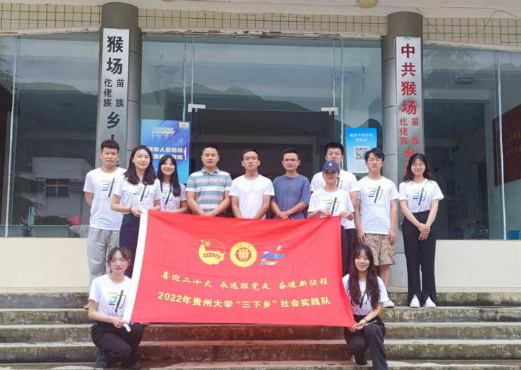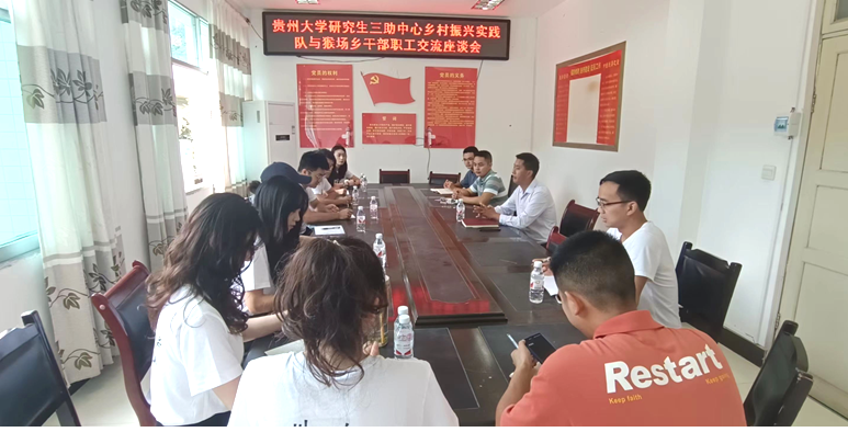 团委网站讯7月21日上午,研究生三助中心乡村振兴实践队抵达贵州省安顺市脱贫攻坚先进集体普定县猴场乡人民政府,与猴场乡干部进行学习交流,并召开工作对接座谈会。猴场乡人大主席谢国松,乡党委委员、武装部长、副乡长张政皓,乡村振兴负责人卢德勇,党政办工作员张雷以及社会实践队全体成员共同参与。