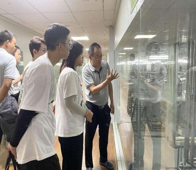 随后在品控经理费建军的引领下我们对恒力源集团的生产区域进行了参观学习。谭书明副院长从刺梨的清洗、破碎、压榨、酶解、降温、过滤、浓缩、杀菌、灌装等一系列初加工过程中存在的注意事项对企业的品控人员以及同学们进行了普及,面对面的答疑解惑。