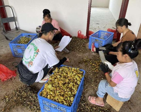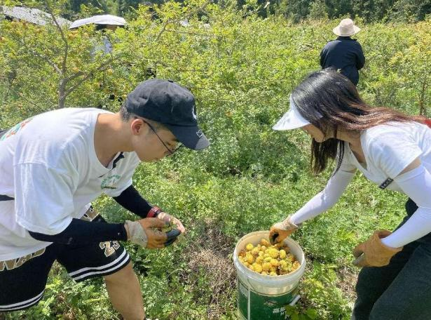 之后,在高堡村杨主任的带领下,我们从刺梨的采摘开始,一边和农户一起参与初加工过程,一边为老百姓普及在初加工的过程中如何提高刺梨产品质量以及注意事项。来到基地后,我们看到了顶着烈日高阳专心采摘的农民们,当我们投入到他们的行列中时,才更加真切体会到了他们的艰辛。刺梨树以及刺梨果上那一根根扎人的刺,我们只是短暂体验就觉得不太适应,然而他们却是一直在坚持在自己的岗位上。
